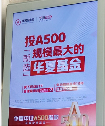 10月29日,新浪证券发文称,华夏基金一则有关发行中证A500指数基金的营销图片涉嫌虚假宣传问题,引发舆论关注。文章引述市场人士观点称,华夏基金在电梯间内的该则推介广告,“投A500就选规模最大的华夏基金”用大字标识,清晰显著;而实际上华夏基金仅仅是在ETF领域规模第一,却用小字体写出,或存在误导性陈述。