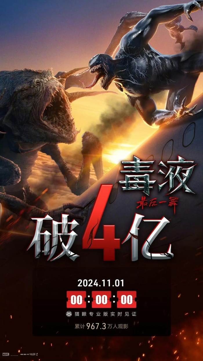 据猫眼专业版数据,截止11月1日0时0分,电影《毒液:最后一舞》(以下简称《毒液3》)在上映8天后票房突破4亿元。这样的票房成绩在漫威电影中可谓突出。