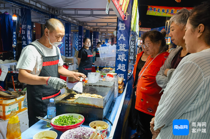 夜市摊位上印有“‘村BA’篮球超级联赛”的字样,这场赛事吸引了众多市民游客前来参观,来自省内外的特色美食小吃“粉墨登场”。精彩的球赛吸引群众的目光,美食美味调动人们的味蕾。现场热闹非凡,篮球+美食,让这个夜晚充满激情与欢乐。