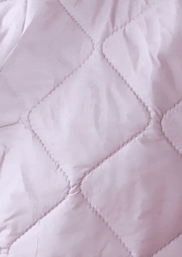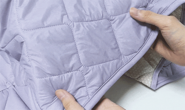 细密的菱格型绗缝工艺牢牢锁住填充物,使劲揉搓拍打也没有发现钻绒现象。