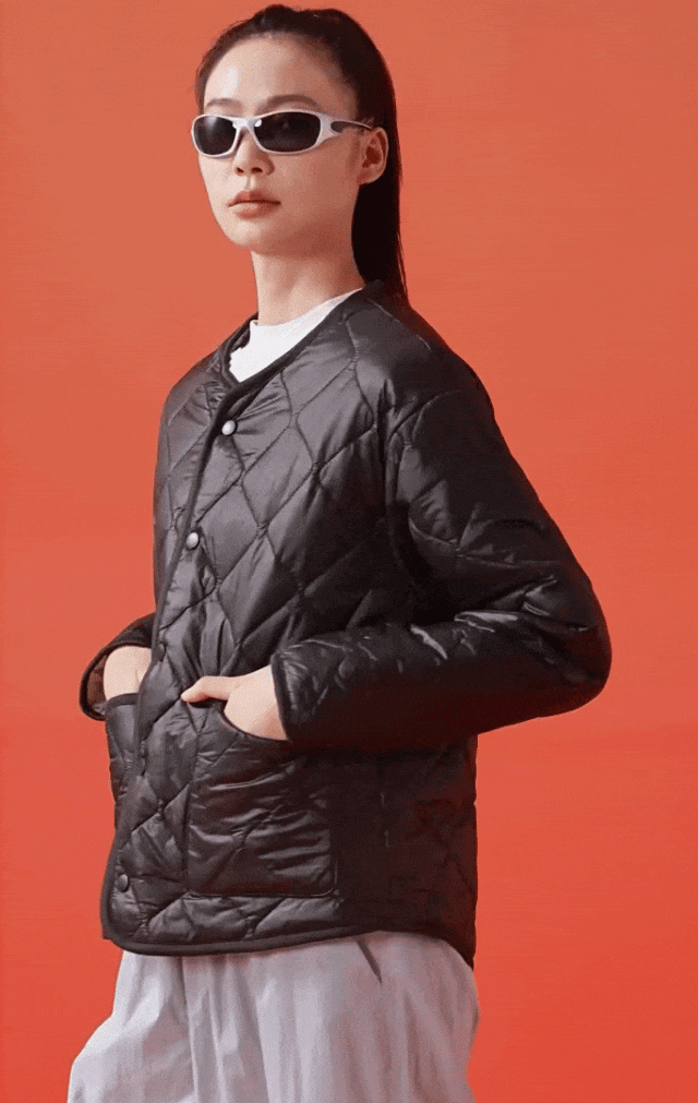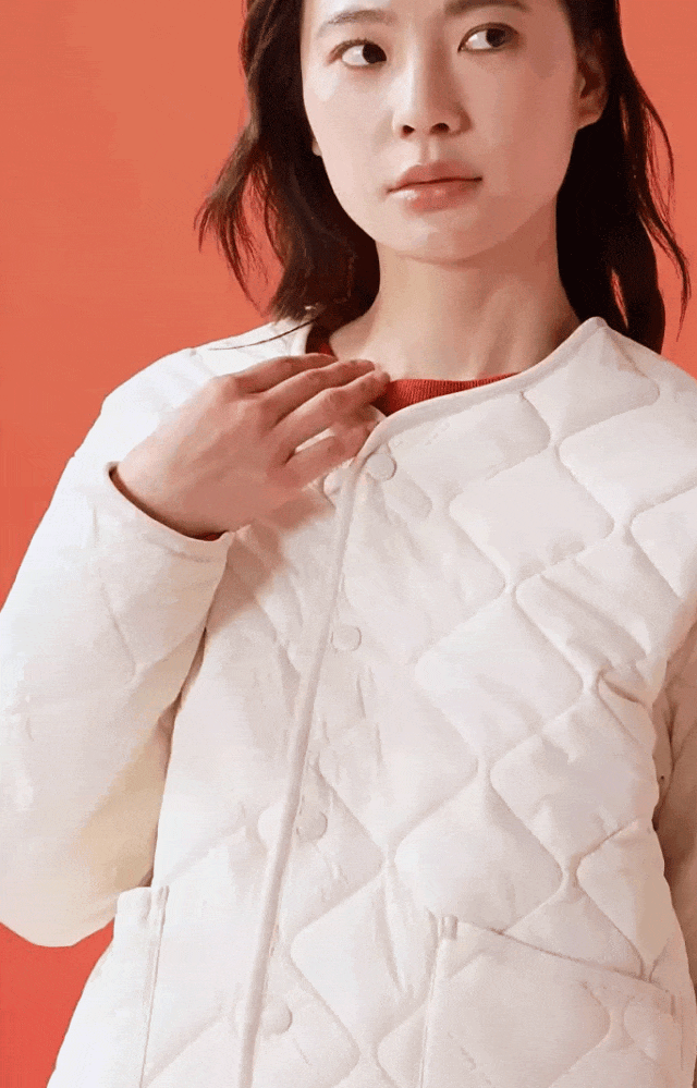 绗缝技术,减少视觉上的膨胀感,上身看起来轻盈、利落、显瘦。