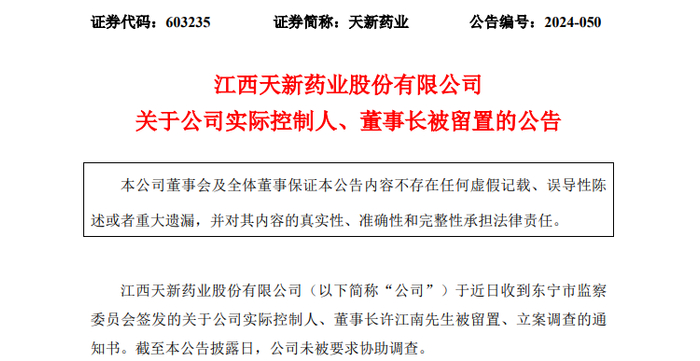 11月1日晚间,天新药业(603235)公告称,于近日收到东宁市监察委员会签发的关于公司实际控制人、董事长许江南被留置、立案调查的通知书。
