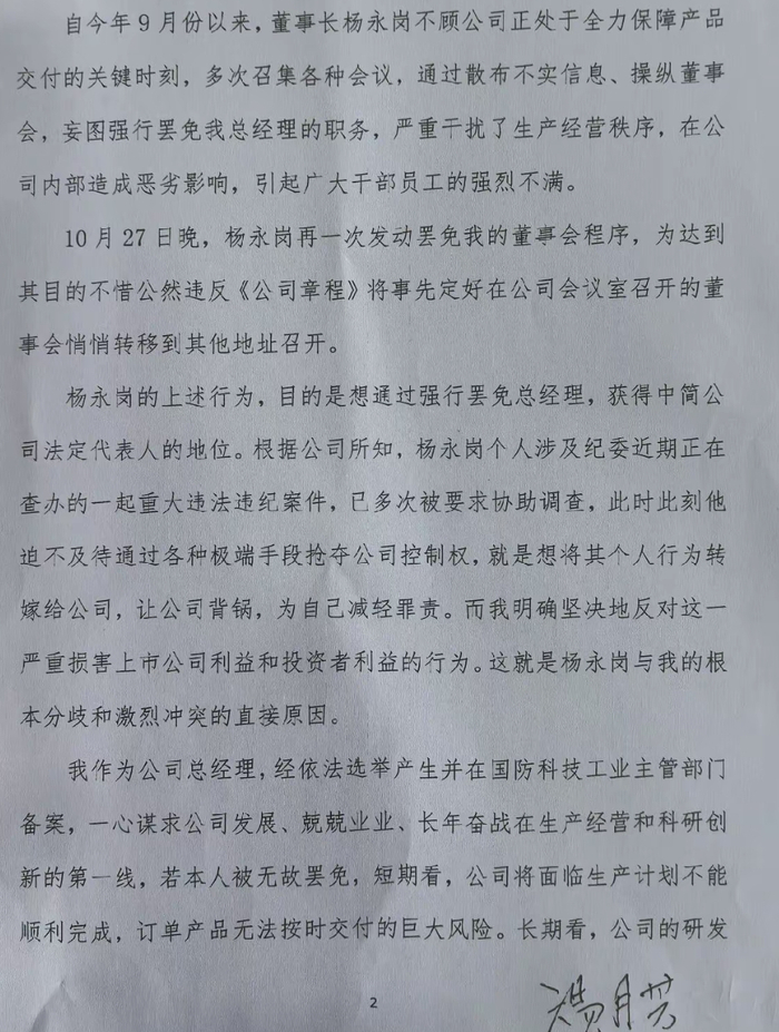 温月芳称,自今年9月份以来,中简科技董事长杨永岗不顾公司正处于全力保障产品交付的关键时刻,多次召集各种会议,“通过散布不实信息、操纵董事会,妄图强行罢免温月芳总经理的职务,严重干扰了生产经营秩序,在公司内部造成恶劣影响,引起广大干部员工的强烈不满”。