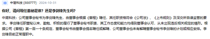 但10月31日,中简科技在互动易平台回复投资者称,公司董事会秘书为李剑锋,目前正常履职中。