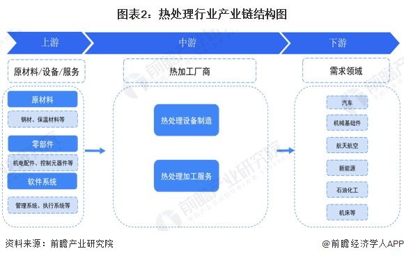 热处理产业链上游为热处理设备原材料生产企业,主要原材料为钢材类产品、保温材料、机电配件、控制元器件等;中游主要为热处理设备制造厂商和热处理加工服务提供商;下游为汽车、机械工程、航天航空、新能源、石油化工等。热处理产业链结构图如下: