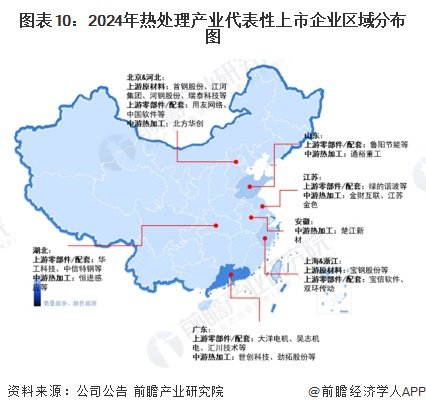 从代表性企业分布来看,热处理产业代表性企业主要分布在北京、广东、山东、江苏等省市。此外,湖北、浙江、上海等地亦有代表性上市公司。