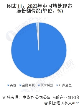 中国热处理行业市场集中度较低,主要由于热处理行业企业规模普遍较小,主要为小微企业为主,行业专业热处理企业1万余家,规模以上企业数量约1500家,占比为15%。2023年,中国热处理行业龙头企业金财互联热处理业务营收为7.44亿元,市场占有率仅为0.65%。2023年金财互联、顶立科技和江苏金色三家热处理行业上市公司合计市占率仅为1.35%。