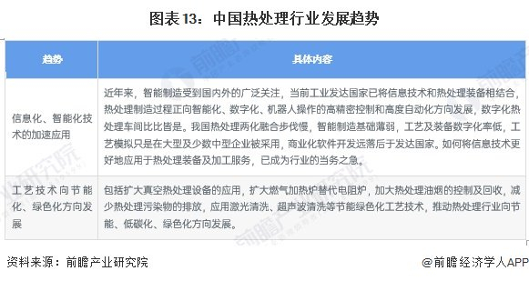 展望未来,中国热处理行业主要呈现信息化、智能化技术加速应用,以及工艺技术向节能化、绿色化方向发展的发展趋势: