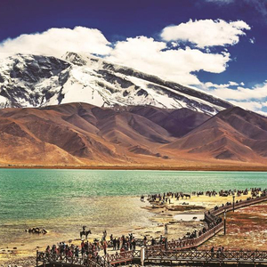 喀拉库勒湖,洁白的雪峰、湛蓝的湖水与如织的游人相映成趣。