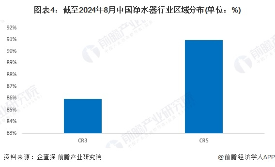 据企查猫统计数据,截至2024年8月,全国共有存续、在业净水器产业相关企业873家,其中浙江省净水器企业数量最多,为399家。净水器区域集中度CR3为86%;CR5为91%。