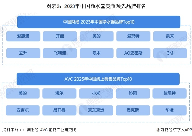 根据中国财经报道榜单,中国十大净水器品牌包括爱惠浦、开能、美的、爱玛特、泉来、飞利浦、浪木、立升、A.O.史密斯、3M等,上述企业同时也入选了中国十大家用净水器品牌榜单。2023年中国净水器线上销售十大品牌包括美的、海尔、小米、沁园、佳尼特、安吉尔、易开得、京东京造、奥克斯、华凌。
