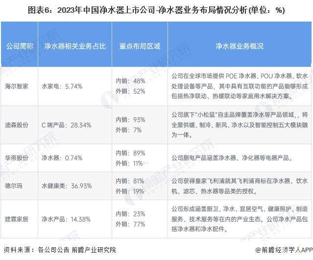 净水器行业的上市公司中,大部分企业全面覆盖国内外市场,相较而言,建霖家居和海尔智家在国外业务布局上更为积极;同时,从业务占比可以看出,德尔玛、建霖家居净水器业务布局力度较大。