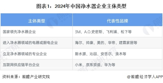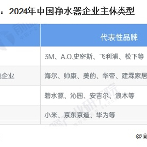 从中国净水器企业主体类型来看,国内净水器市场现阶段主要被四类企业占据:一是全球性企业,包括3M、A.O.史密斯等;二是进入净水器领域的电器或厨电企业,包括美的、海尔、帅康等;三是立足净水器领域的专业企业,包括碧水源、沁园、安吉尔、浪木等;四是依托互联网供应链进入净水器领域的小米、京东京造、华为等企业。