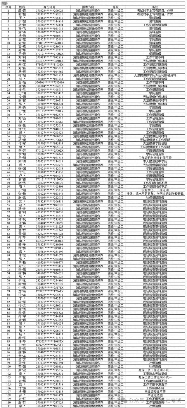 山东省消防救援总队消防行业职业技能鉴定站在开展消防设施操作员职业技能鉴定时,有111名考生在报名及考试过程中存在报考资料违规造假和考试作弊情况,根据《技能人才评价违纪违规行为处理工作指引(试行)》相关规定,对以上考生作出禁考两年的严肃处理决定。