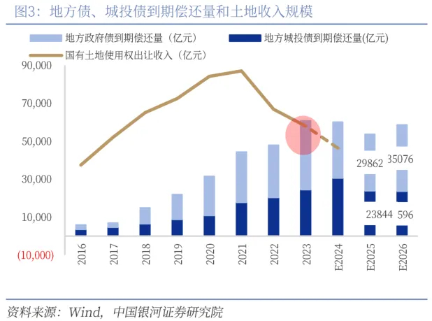 三年6万亿化债或主要弥补土地收入降低形成的偿债来源缺口。从近年来土地出让收入缺口的角度分析,我们认为政府债置换规模在6万亿左右或是合宜水平。主要基于政府性基金收入是过去专项债和城投债的主要偿债来源,根据《地方政府专项债务预算管理办法》规定,专项债务本金通过对应的政府性基金收入、专项收入、发行专项债券等偿还,这其中过去主要是地方土地出让收入,占政府性基金收入80%以上。而在地产持续低迷之下,自2023年起地方土地收入已经低于政府债和城投债的到期偿还量,继而导致地方偿债压力加大、财政支出缩减。从这角度来看,本轮债务化解的主要出发点应是弥补近年来地方因房地产造成的收入缺口。