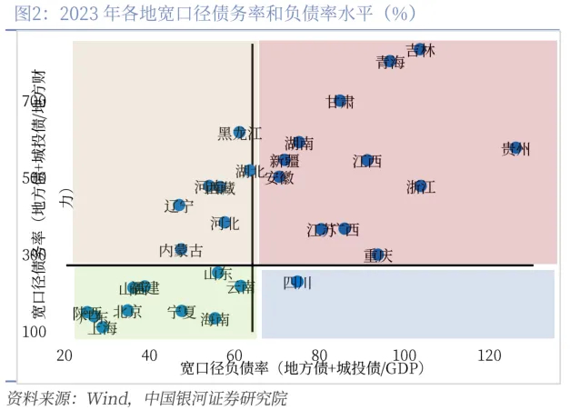 过去及未来两年,土地收入总缺口或在6.4万亿左右。我们测算,2022年-2024年政府性基金总收入较年初预算缺口在4.2万亿元左右。且未来两年时间里,财政逆周期扩张需要保障政府性基金收支规模的适度增长,土地收入每年或仍有1万亿左右的收入拖累效应,合计约6.4万亿元收入缺口。从新增政府额度补充土地收入缺口的角度来看,6万亿左右的化债规模能够一定程度上弥补地方因土地收入大幅降低导致的收入缺口,增强可支配财力。从支持方向上来看,本次债务置换旨在增加地方政策财力,因此我们认为广义债务率较高地区或将获得更多化债额度。
