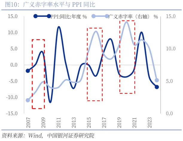 2025年广义赤字率有望大幅回升,带动经济和物价水平温和回升。因此,考虑明年财政对经济的拉动作用,不能仅盯着新增政府债券规模,还需考虑明年广义赤字率水平能否大幅回升。我们认为前期财政部发布会上提出“逆周期调节绝不仅仅是以上的四点,这四点是目前已经进入决策程序的政策,我们还有其他政策工具也正在研究中”。其他政策工具除了进一步加码的中央赤字(超长期特别国债)外,或许还有广义财政工具的加码。例如PSL等政策工具的降息重启。我们预计明年超长期特别国债发行规模或在2万亿左右,6万亿化债额度或主要集中在明年发行,规模或在3万亿左右,专项债额度考虑到增加了土地和商品房收购,发行规模或提升至4.2万亿元,PSL或其他政策性金融工具用于配合新增100万套改造房建设的额度有望提升至8000亿左右。考虑到以上主要工具,我们测算出明年广义赤字率或能提升至12.5%,以此便能有效拉动经济和物价水平的企稳回升。