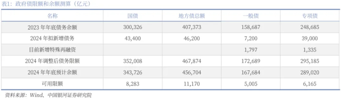 根据财政部数据显示,截止2023年年底国债余额为30.03万亿元,地方一般债余额为15.87万亿元,地方专项债余额为24.87万亿元,根据年初预算草案安排,今年拟发行的国债规模为3.34万亿元、超长期特别国债1万亿元,地方一般债0.72万亿元,专项债3.9万亿元。此外,今年额外净融资的特殊再融资债务有3000多亿元,其中特殊再融资一般债1797亿元,特殊再融资专项债1335亿元。按照今年债券发行安排和新增的特殊再融资债券安排,合计国债余额和地方余额或分别为34.37万亿元、45.67万亿元,对比35.2万亿元、46.78万亿元的债务限额,总计还有约8283亿元国债限额和1.1万亿元地方政府可用限额,其中一般债可用限额5005亿元,专项债可用限额6165亿元。