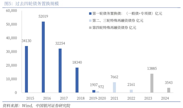 我们认为置换为国债的可能性和必要性较小。从过去三轮的债务置换经验来看,均是通过增加地方政府债务的方式完成。其中第一轮债务置换(2015-2018年)主要是用地方政府债券置换非政府债券形式的存量政府债务,总规模约12.2万亿元,首次债务置换主要是《预算法》修订后对地方债务形式的转换,实际上不属于隐性债务置换;第二轮债务置换(2019年-2021年9月)则是用置换债化解隐性债务,即“建制县隐债化解试点”,仅涉及6个省内的36个地区开展,置换规模为1579亿元;第三轮债务置换(2020年底-2022年6月)是发行特殊再融资债置换隐性债务,包括建制县隐债化解试点、全域无隐债试点两部分,涉及地方债规模约1.1万亿元。第四轮债务置换(2023年10月-2024年9月):这一轮债务置换的特征是特殊再融资债重启发行、同时发行了部分“特殊新增专项债”(未公布两书一案的新增专项债)置换隐性债务、偿还政府拖欠企业账款,合计规模约2.6万亿元。