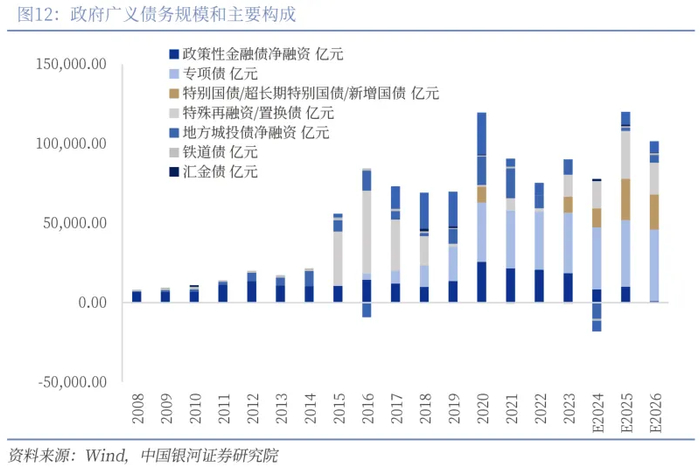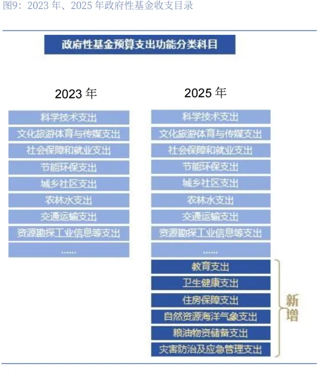 目前来看,债务是否计入赤字率,以及实际赤字率的高低已经并不十分重要,其更多是体现出的是对政府举债用途的分类,例如用于经常性支出的债务理应计入赤字率,而用于项目建设且具有投资收益的资本性支出可以纳入政府性基金预算管理,这也是国际通行做法。目前来看,伴随新型城镇化建设,以及生育和养老对公共基础设施和公共服务的需求提升,未来仍有较大的投资需求。在这方面,纳入政府性基金管理的超长期特别国债或将能够发挥更多的作用,我们也注意到2025年新修订的《财政收支科目分类》里,其中在政府性基金支出下新增了教育、医疗、保障房支出科目,下设款项为“超长期特别国债安排的支出”。这或是一个重要转变。