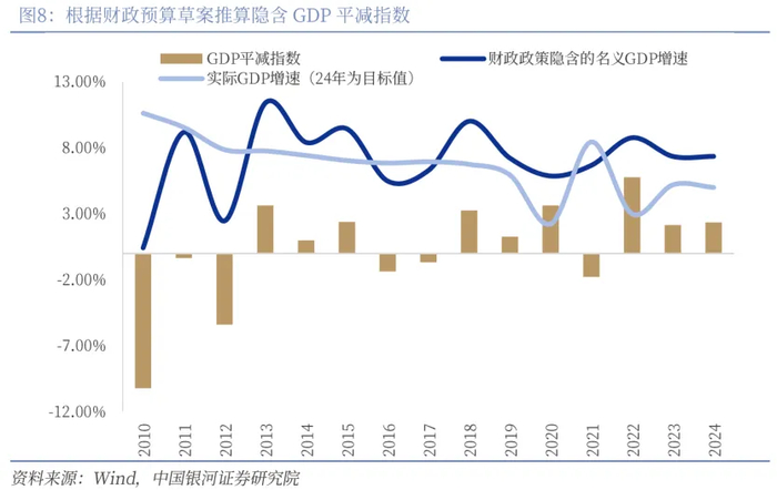 此外,所谓赤字率的概念是新增债务规模与名义GDP规模的比值,其还受到物价水平的影响。例如去年目标赤字规模为4.06万亿,其对应的名义GDP规模为135.3万亿元,其中隐含对今年物价水平GDP平减指数为2.36%。