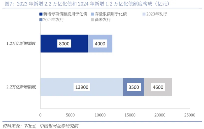 我们认为,2023年安排的2.2万亿专项债额度是在往年一般债和专项债结存限额中盘活的存量(即过去每年新增地方债务限额里没有用完的部分),这部分主要是以特殊再融资债券的形式发行,而2023年发行了1.39万亿元,2024年截止10月份又发行了3500亿元,也就是说去年批复的2.2万亿额度,目前还有4600亿元尚未使用完。