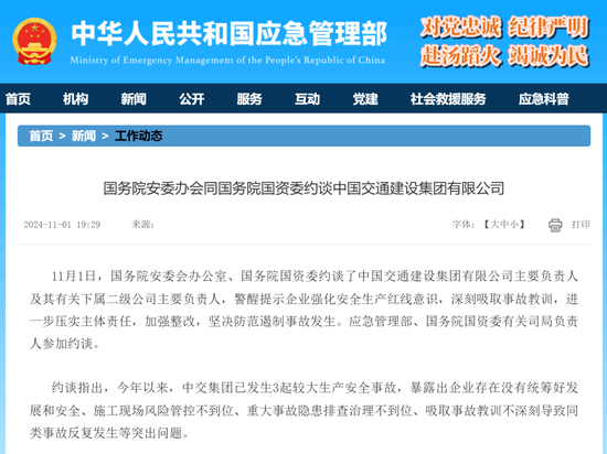 11月1日,应急管理部官网显示,国务院安委办会同国务院国资委约谈中国交通建设集团有限公司(以下简称中交集团)。