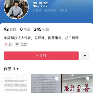 上证报记者注意到,同日,在抖音平台上,一个名为“温月芳”、简介为“中简科技法人代表、总经理、副董事长、总工程师”的账号连续发布多个视频,内容直指“温月芳”与董事长杨永岗之间的矛盾分歧。