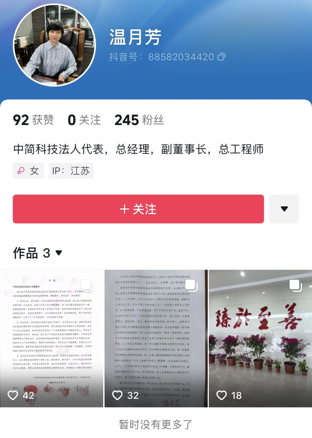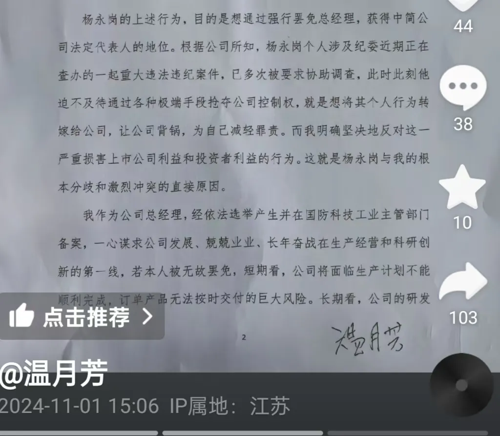 11月1日下午,一个名为“温月芳”,自我介绍为“中简科技法人代表、总经理、副董事长、总工程师”的抖音号发布多个文件,直指温月芳本人与中简科技董事长杨永岗之间的矛盾。