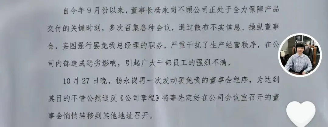 在一份写有“温月芳”个人签字的文件中,“温月芳”表示:“自今年9月份以来,董事长杨永岗不顾公司正处于全力保障产品交付的关键时刻,多次召集各种会议,通过散布不实信息、操纵董事会,妄图强行罢免我总经理的职务,严重干扰了生产经营秩序,在公司内部造成恶劣影响,引起广大干部员工的强烈不满。”