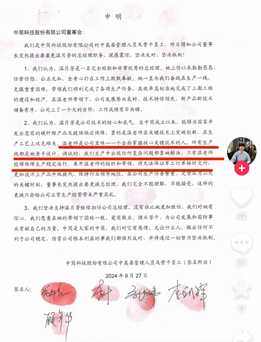 “温月芳”上传的另一份文件则是一份《申明》:“我们是中简科技股份有限公司的中高层管理人员及骨干员工,昨日得知公司董事长突然提出要罢免温月芳的总经理职务,深感震惊,坚决反对,坚决抵制!”