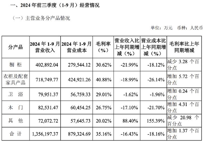其中,橱柜收入下滑21.99%;衣柜及配套家居产品下滑18.99%;卫浴下滑1.62%;木门下滑17.10%;其他增长88.40%。