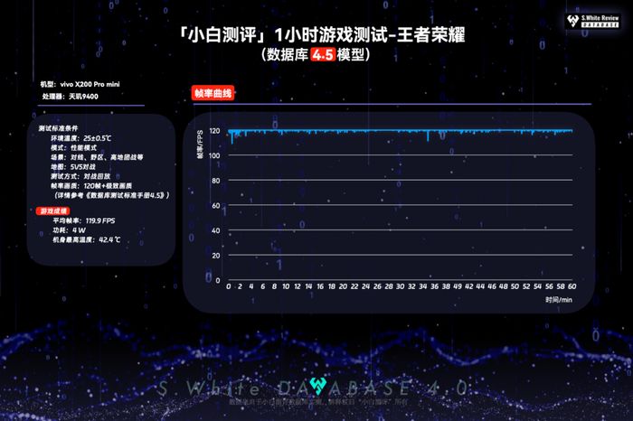 vivo X200 Pro mini游戏实测: ①一小时《王者荣耀》:平均帧率119.9FPS,功耗4W,机身最高温度42.4℃;②《原神》(数据库4.5模型):平均帧率59.7FPS,功耗4.8W,机身最高44.5℃;③超高压场景《星穹铁道-黄金的时刻》:平均帧率58.1FPS,功耗6.7W,机身最高49.3℃。