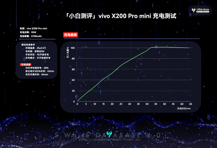 vivo X200 Pro mini充电实测:90W充电功率,25℃测试标准环境温,10分钟快速回电28%,42分钟前台充入100%,64分钟完全充满。