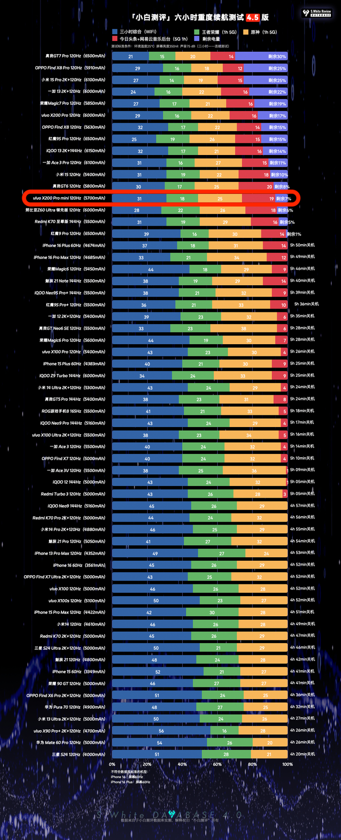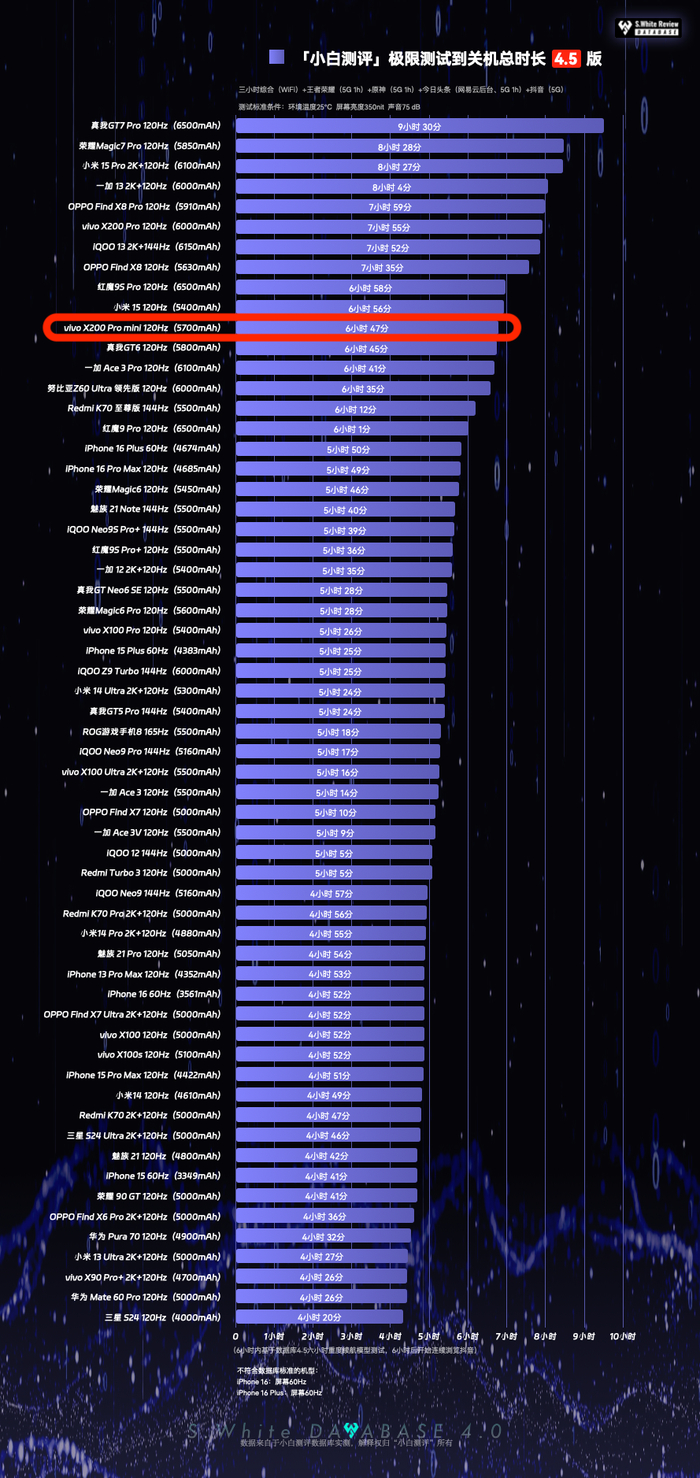 以上基于小白测评数据库4.5模型测试,环境温25℃±0.5℃,屏幕亮度350nit,声音75dB(游戏、六小时、测到关机:性能模式)(数据基于 vivo X200 Pro mini测试时最新版PD2419_A_15.0.16.7.W10.V000L1 系统测试)