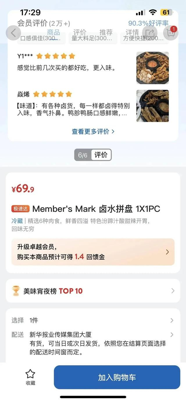 11月1日,记者使用武汉市收货地址查询这款卤水拼盘,发现山姆武汉光谷店仍可购买到这款卤水拼盘,同时商品简介页面与南京店信息一致,线上购物的消费者根本无法获知这款食品是冷冻品。