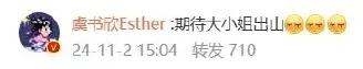 演员虞书欣对此迅速转发并评论道:“期待大小姐出山。”两人此前在电视剧《云之羽》里合作,金靖扮演的角色正是“大小姐”。