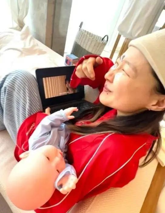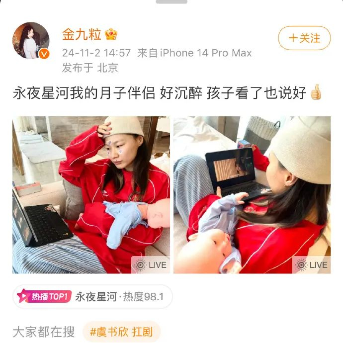 金靖发布的live照片中,她抱着一个逼真的假娃娃,正全神贯注地追剧,配文写道:“永夜星河我的月子伴侣,好沉醉,孩子看了也说好。”