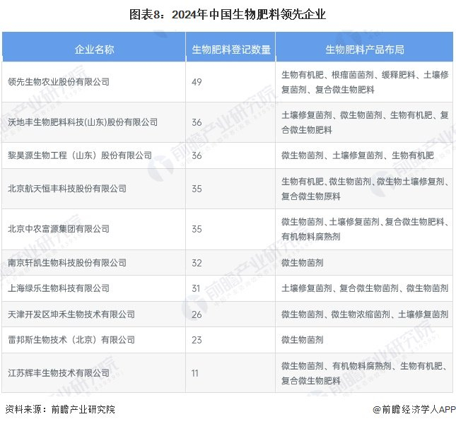 中国生物肥料行业布局企业数量众多,国内主要的肥料生产企业均参与了生物肥料领域的布局,其中领先生物农业股份有限公司、沃地丰生物肥料科技(山东)股份有限公司、黎昊源生物工程(山东)股份有限公司、北京航天恒丰科技股份有限公司、北京中农富源集团有限公司、南京轩凯生物科技股份有限公司、上海绿乐生物科技有限公司、天津开发区坤禾生物技术有限公司、雷邦斯生物技术(北京)有限公司、江苏辉丰生物技术有限公司等企业在生物肥料登记数量方面较为领先。