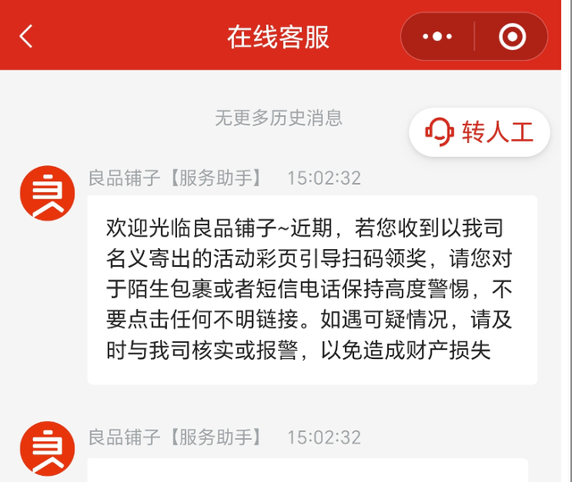 由于投诉举报的消费者很多,良品铺子的客服对话将提示受骗的信息置顶。