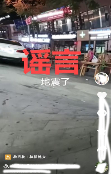 2024年5月,网民尹某为博人眼球在某短视频平台发布仁寿“地震了”视频,引发当地大量网民关注、议论和恐慌。经公安机关核查,尹某用手机拍摄仁寿街道画面,使用虚构地震视频并配文“地震了”。尹某造谣“仁寿地震”的行为,扰乱社会公共秩序。目前,尹某已被依法处以行政处罚。