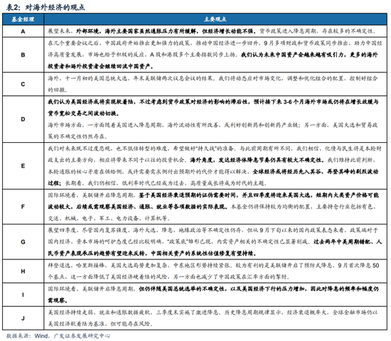 对于海外经济的观点, 基金经理们都认为美联储的降息政策对全球流动性和资产估值有积极影响,但是,对美国经济后续走势存在分歧,部分认为预防式降息下美国经济有望软着陆,而部分认为美国经济持续走弱,就业和通胀数据疲软,全球金融市场仍以美国经济软着陆为基准,但可能存在风险。同时,他们关注美国大选、地缘政治风险、降息节奏和全球经济波动对中国资产的潜在影响。尽管存在不确定性,但都认为中国的稳健经济和政策支持使得中国资产在全球市场中具有相对吸引力。