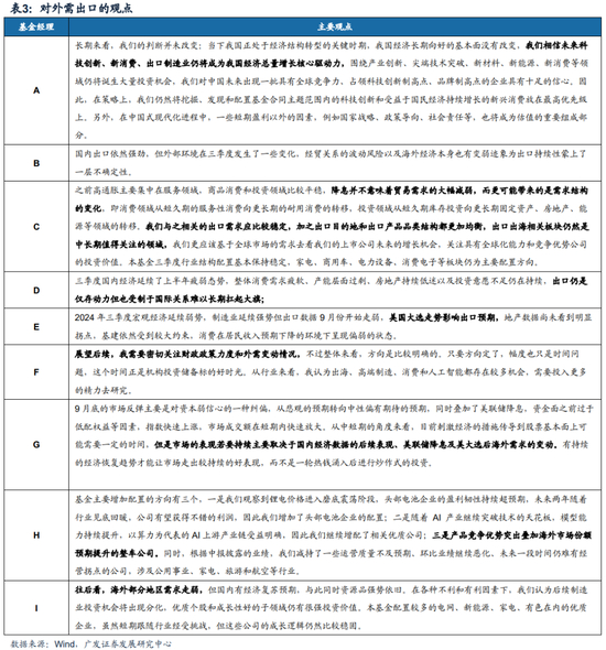 2.部分基金经理认为出海板块是中长期值得关注的逻辑。之前高通胀主要集中在服务领域,商品消费和投资领域比较平稳,降息并不意味着贸易需求的大幅减弱,而更可能带来的是需求结构的变化,即消费领域从短久期的服务性消费向更长期的耐用消费的转移,投资领域从短久期库存投资向更长期固定资产、房地产、能源等领域的转移。我们与之相关的出口需求应比较稳定,加之出口目的地和出口产品品类结构都更加均衡,出口出海相关板块仍然是中长期值得关注的领域,我们更应该基于全球市场的需求去看我们的上市公司未来的增长机会,关注具有全球化能力和竞争优势公司的投资价值。