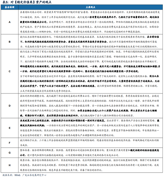 焦点问题4——对【稳定价值类】资产的观点:分歧较大。从风格的角度来说,随着风险偏好的提升,红利资产的防御属性可能被抛弃,但就这点而言,经理们的分歧较大。从个股角度来说,经理们寻找优质个股,股息仍然是股东回报的一个重要考量。在高股息资产内部,部分经理更倾向于切向一些股息率已经较高的消费股包括保险。