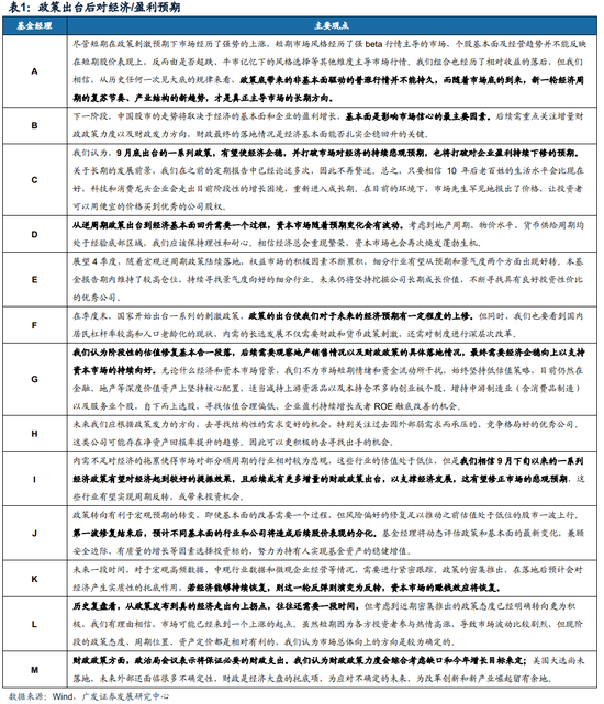 焦点问题1——政策出台后对经济/盈利预期的变化:政策扭转、预期修复是一致判断,但实际基本面的判断有分歧。部分经理认为当前政策已经可以上修基本面预期,部分经理认为从政策发布到真的经济走出向上拐点,还需要更多财政发力,也往往还需要更多时间。很多经理认为,当前阶段性的估值整体修复基本告一段落,后续挖掘优质个股是主要思路。