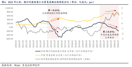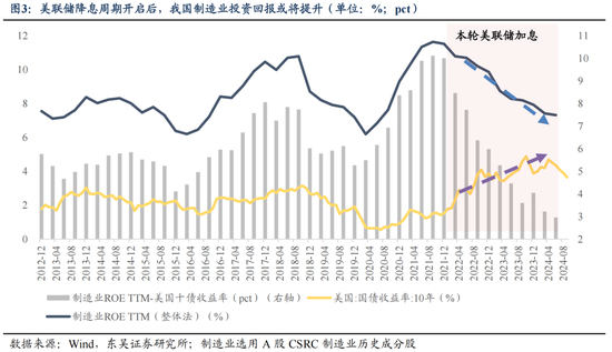 美元下行周期对我国基本面传导可以从宏微观层面解构:1)从宏观层面来看,美联储加息阶段,紧缩的金融条件对全球制造业需求和生产补库活动形成压制,直接影响我国制造业的量价与盈利水平;2)从微观层面来看,美元利率高企使得出口导向型制造业投资回报与美债投资收益的差值缩小,到2024年中已回落至3pct的历史低位水平,这意味着我国具备全球竞争力的制造业企业在高息环境中选择结汇并再投资的性价比降低。