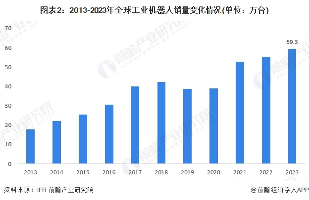 随着自动化技术的发展以及工业机器人技术的不断创新,全球对工业机器人的需求已明显加快。2013-2017年,全球机器人销量年均复合增长率(CAGR)约为19%,与以往相比,工业机器人的销量从未如此大幅度地增加过。根据IFR(国际机器人联合会)在最新发布的报告中测算,2023年,全球工业机器人安装量增加至59.3万台,涨幅达7%左右。