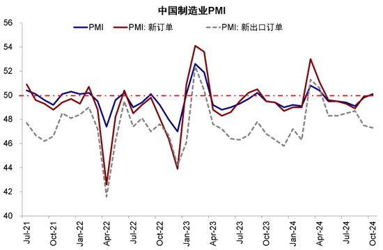1) 政策驱动10月中国PMI重回扩张区间,但结构分化改善仍不平衡。10月中国官方制造业PMI环比上升0.3ppt至50.1%,高于市场预期(Bloomberg预测中值为49.9%);10月非制造业商务活动指数环比上升0.2ppt至50.2%。降息降准、超长期特别国债支持两新、以及财政投放加速等政策驱动PMI重回扩张,但结构上来看主要由补库存驱动的原材料制造业所带动,其他大类行业环比下降,大中型企业环比上升,而小型企业环比下降。行业和结构的分化显示制造业改善仍不平衡,需待更多增量政策的支撑。基建支撑建筑业,而房屋建筑业仍然偏弱。国庆假期推动出行相关服务业。