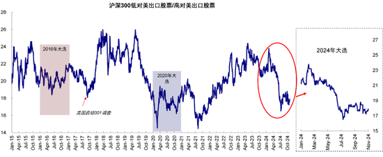 图表:相比海外资产,中国出口链可能尚未明显反映选情变化