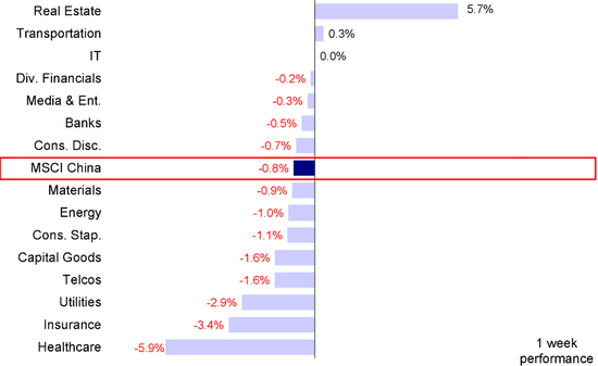 图表:上周MSCI中国指数下跌0.8%,房地产领涨,但医疗保健与保险承压